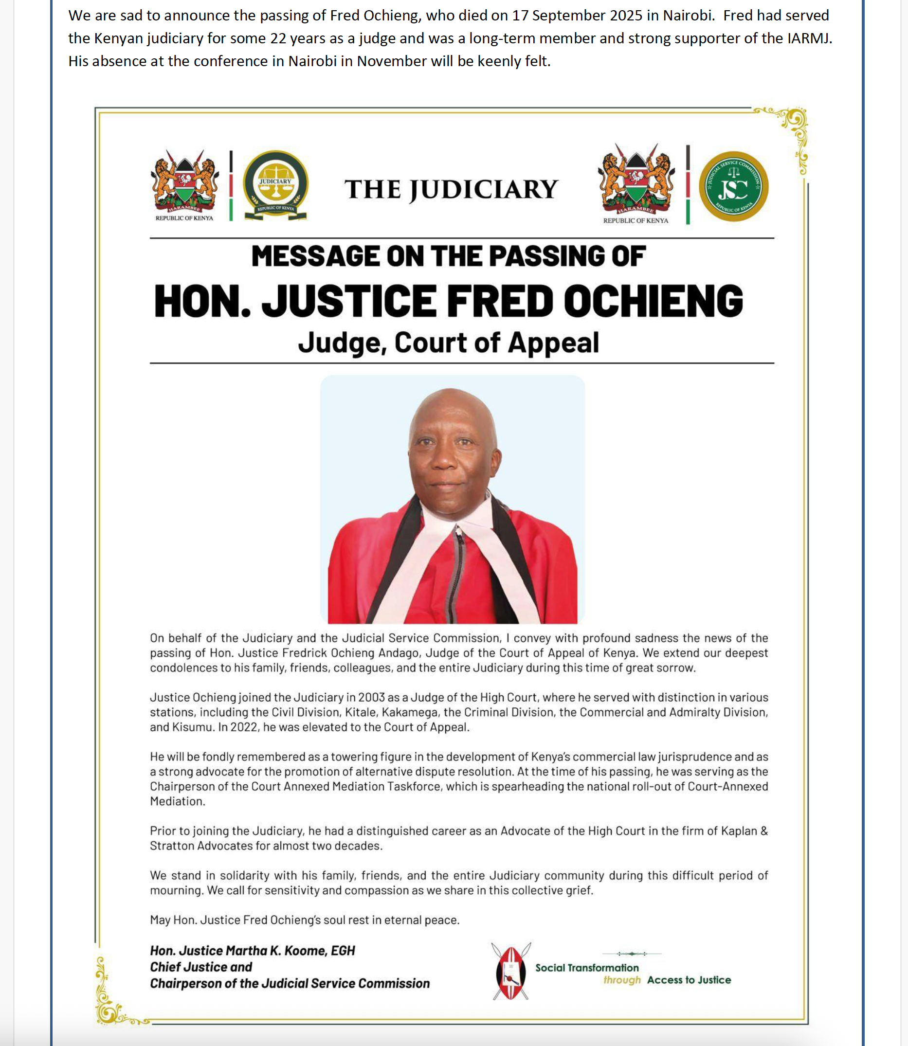 We are sad to announce the passing of Fred Ochieng, who died on 17 September 2025 in Nairobi. Fred had served the Kenyan judiciary for some 22 years as a judge and was a long-term member and strong supporter of the IARMJ. His absence at the conference in Nairobi in November will be keenly felt.